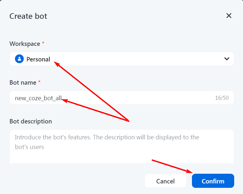 Нажимаем слева вверху на кнопку CREATE BOT. Попадает на страничку где надо задать первичные параметры бота. Для Workspace доступен только выбор PERSONAL. Задаем имя бота, в нашем случае — new_coze_bot_all . Описание — Bot description не обязательно (звездочка около поля не стоит) хотя желательно чтобы по прошествии времени знать что может бот, какие у него возможности.