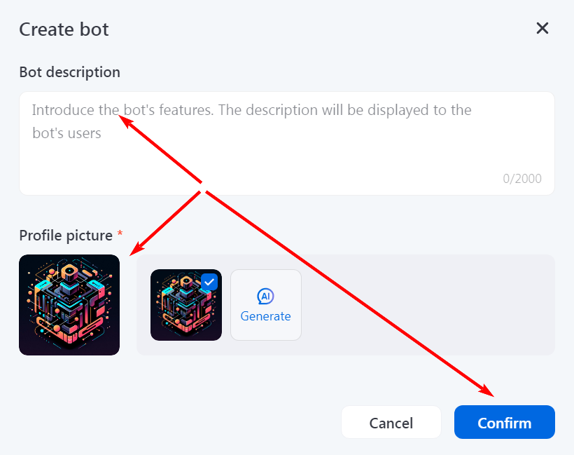 Далее выбираем картинку для бота. Картинку можно генерировать тут же с использованием этой же нейросети. Далее жмем кнопку CONFIRM.