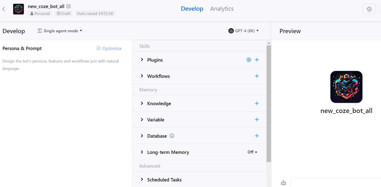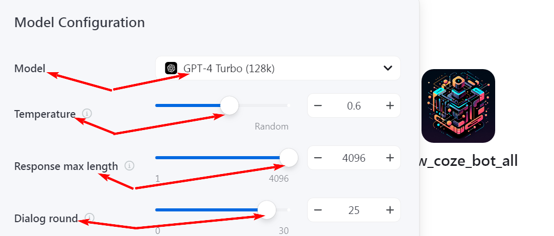 Попадаем на страницу где мы будем задавать основные настройки свойства нашего бота. Первое что выбираем – это модель GPT с которой будем работать. Это в правом верхнем углу. Выберем GPT-4 Turbo (128 K) –в других случаях это платная модель. Для создания ботов в COZA – эта модель пока бесплатна. Пользуйтесь.