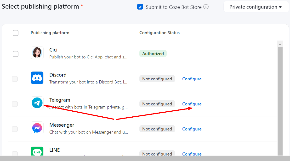Заполнив все эти параметры жмем на кнопку PUBLISH в правом верхнем углу страницы. Переходим на страницу где представлены платформы на которых мы можем публиковать нашего бота. Мы выберем в строке Telegram и жмем в конце строки на Configure.