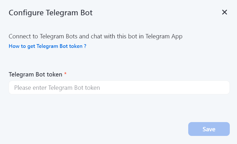 Выходит окно в котором нас просят ввести бот токен из telegram. И описывают как его получить.