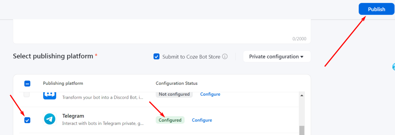 Далее в открывшемся окне в стоке telegram видим зеленым написано configured . Далее ставим крыж в этой строке telegram и нажимаем в правом верхнем углу на кнопку PUBLISH
